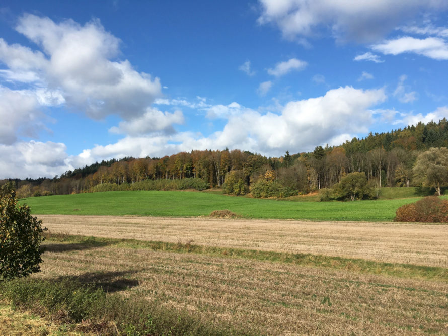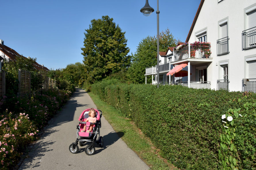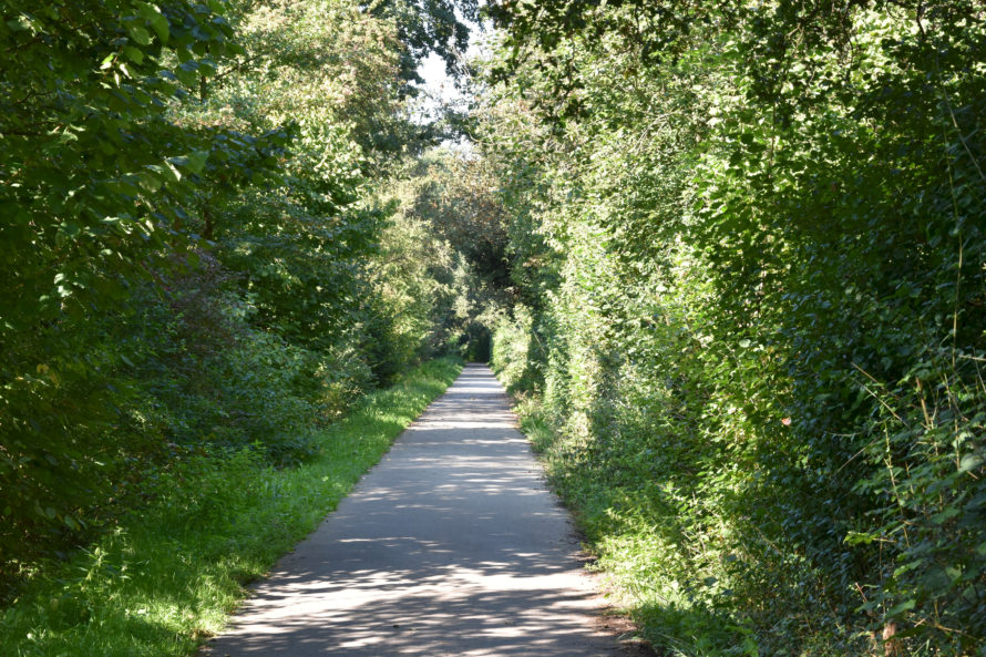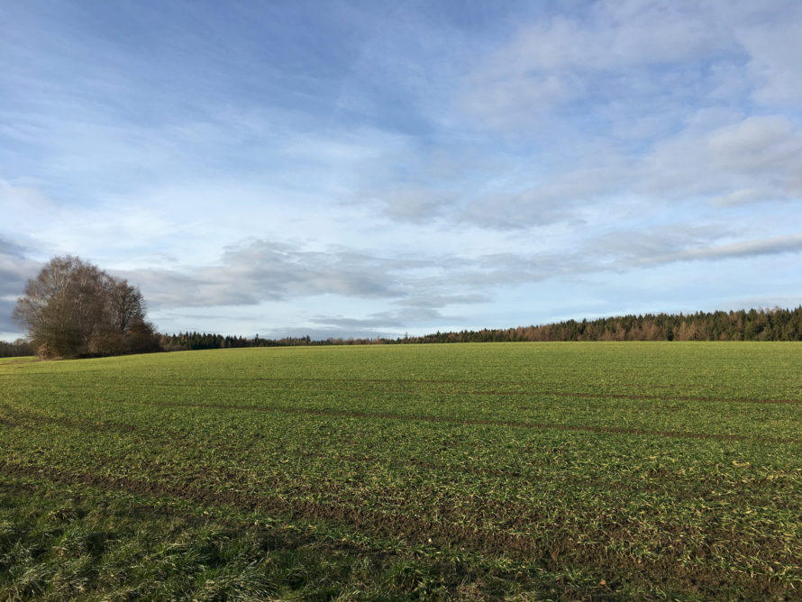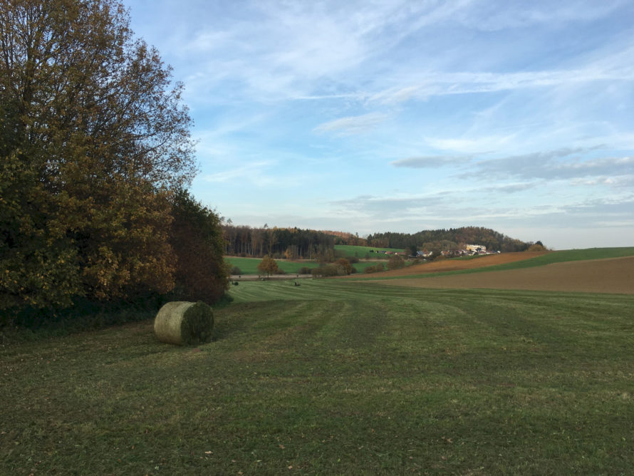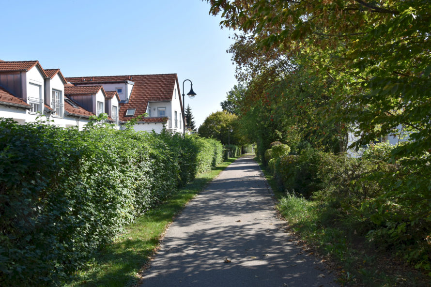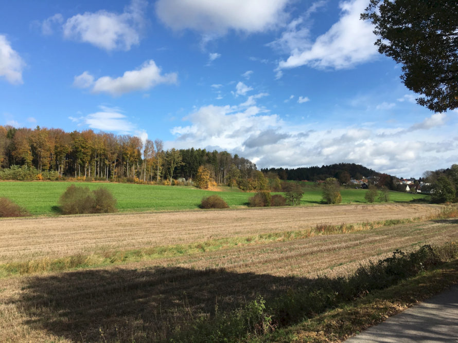Еще одним важным и знаковым для меня местом является велосипедная дорожка в соседний город Neusäß. Сперва она проходит через лес, а после выезда из нашего городка начинается дорога через поле. Выглядит этот участок пути примерно так.