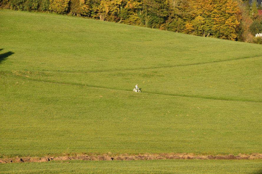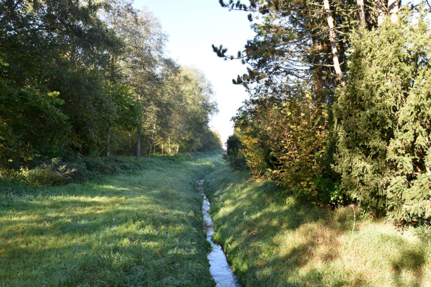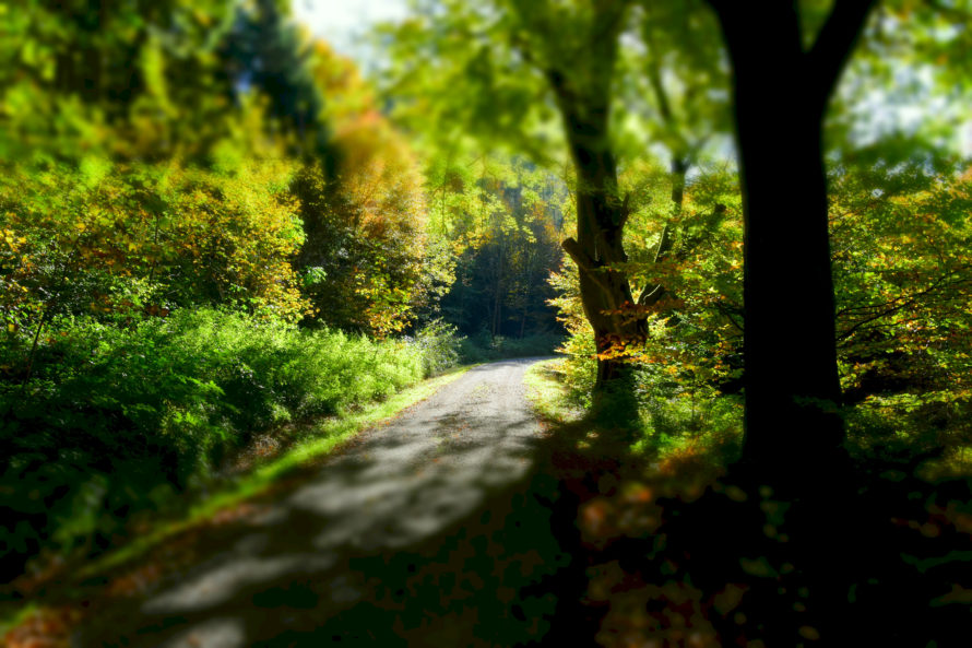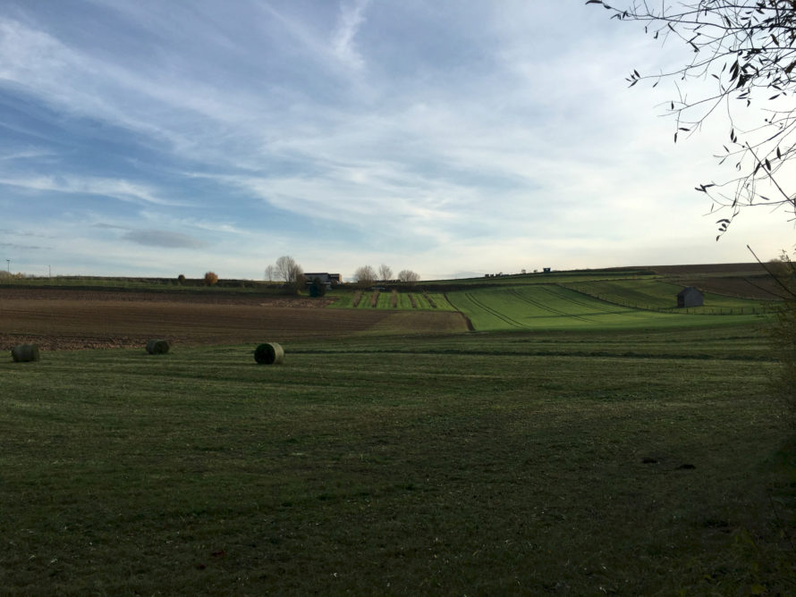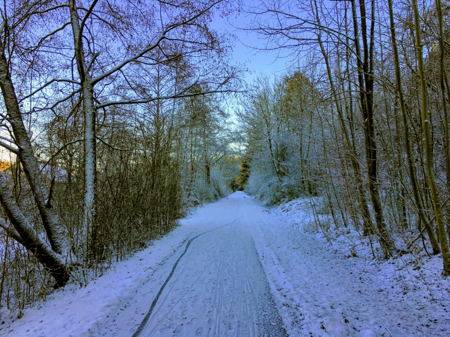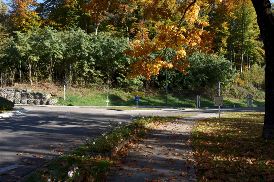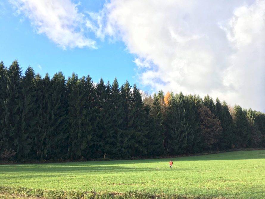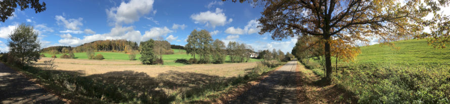 Еще одним важным и знаковым для меня местом является велосипедная дорожка в соседний город Neusäß. Сперва она проходит через лес, а после выезда из нашего городка начинается дорога через поле. Выглядит этот участок пути примерно так.
