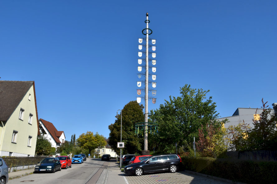Как видите, здесь же стоит наш городской “Майбаум” - майское дерево. Кто не знает, то есть такая традиция, что одна деревня может похитить это дерево у другой деревни, и тогда чтобы вернуть дерево, первая деревня должна отдать другой выкуп. Хоть традиция и старая, и сейчас такое происходит редко, но все-таки периодически происходит, и полиция подыгрывает, то есть не рассматривает такие заявления о краже.