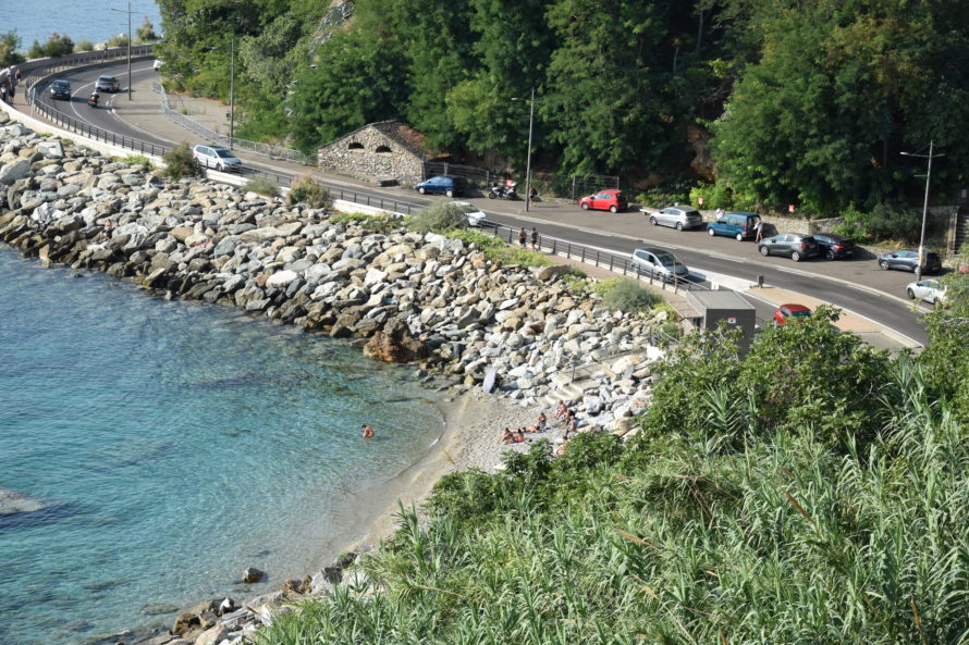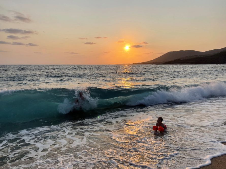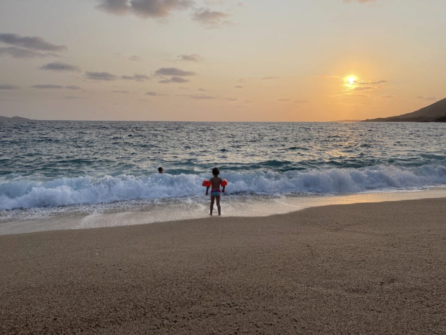 Пляж хорош несколькими факторами. Главным образом, тем что люди практически отсутствуют, что кажется каким-то необычным и уникальным, вспоминая наш прошлый опыт посещения итальянских курортов. Кроме того пляж очень большой и тянется на несколько километров. Песок достаточно крупный, а значит не прилипает так сильно, и достаточно лишь от него отряхнуться. Вокруг зеленые горы, а самое главное море… Вода просто идеальной температуры, и такая чистая. Удивительно! Если сравниваться его с морем материковой Италии, то это просто совершенно другая лига. И дно состоит лишь из песка. Ни тебе камней, ни водорослей, ни морских ежей, ни медуз, ничего. Только песок, а значит ты не боишься на что-то наступить.