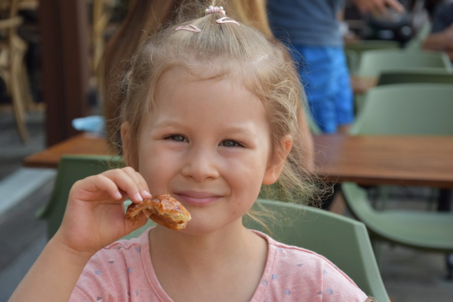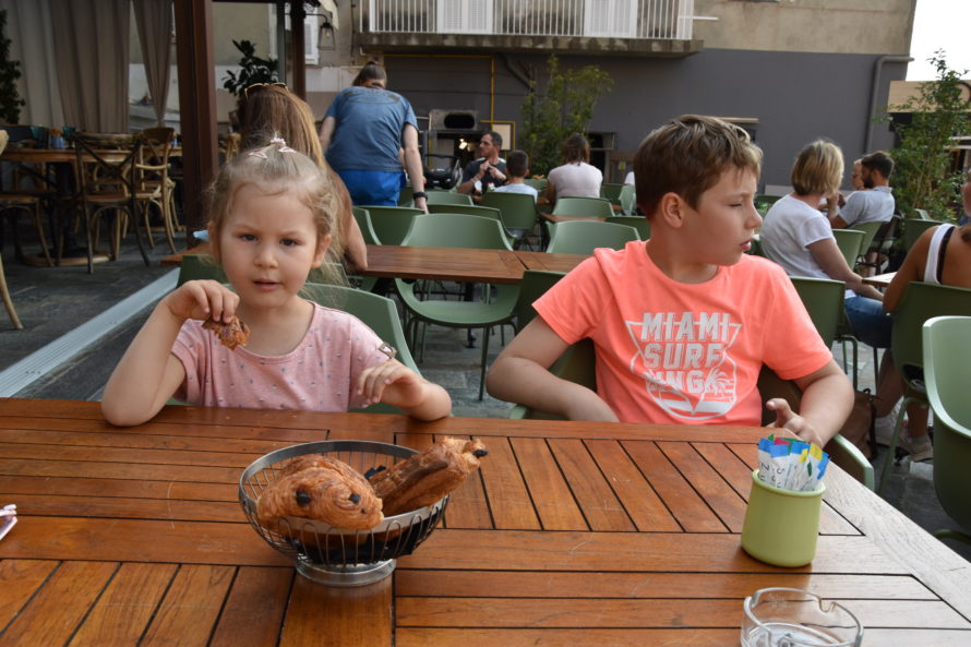 Что заказывают во Франции? Хоть Корсиканцы и не считают себя французами, но мы заказали Круассаны. Дети заказали по соку, а мы с Сашей по кружечке кофе.