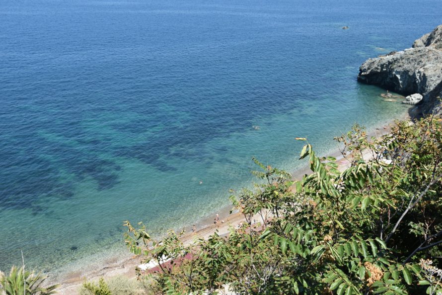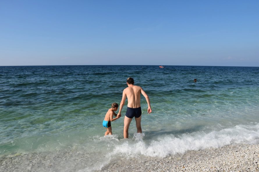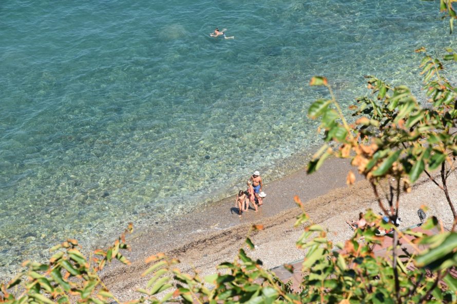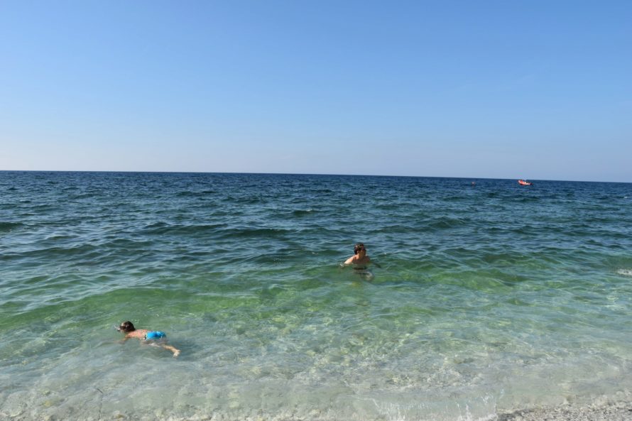 Пляж я выбрал галечный, а если точнее, то крупно-галечный. За счет этого вода тут чистейшая и прозрачная, а у меня как вы, может, помните, свежеприобретенная маска и ласты.