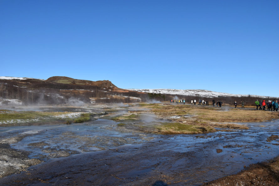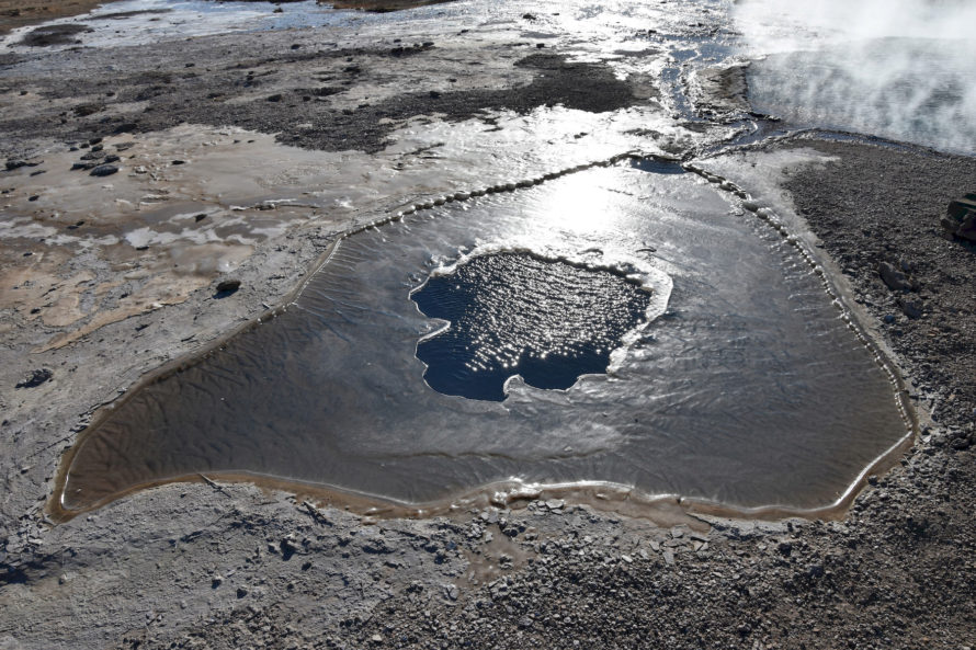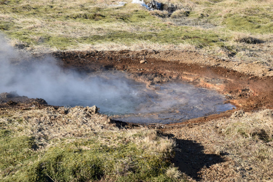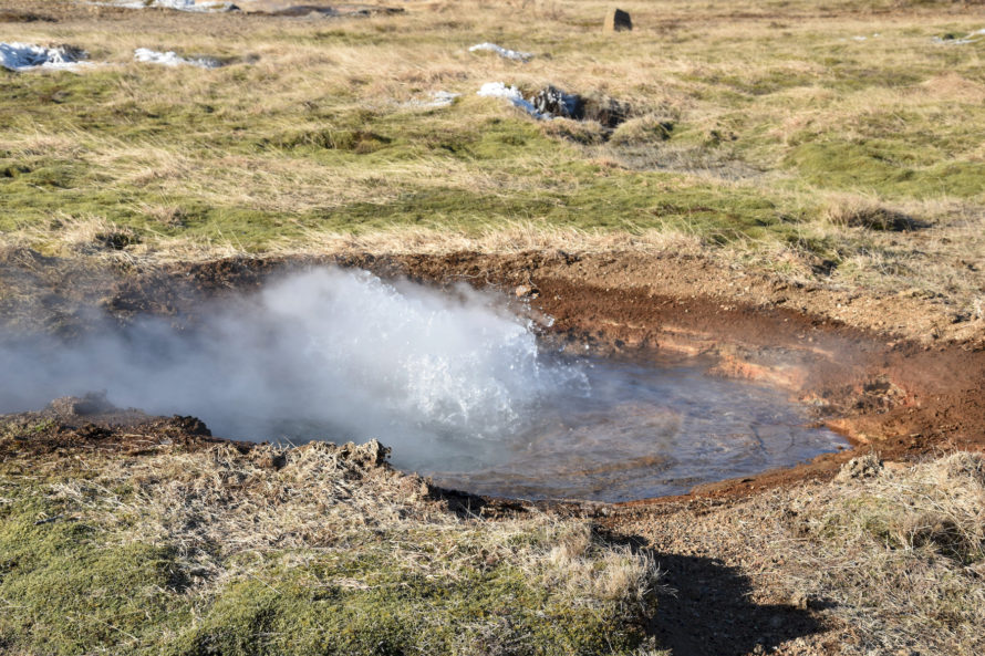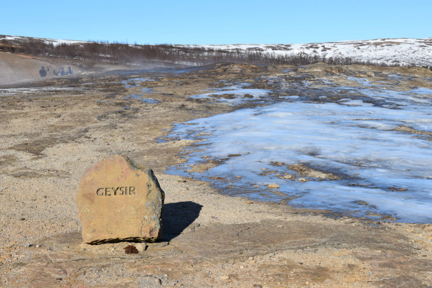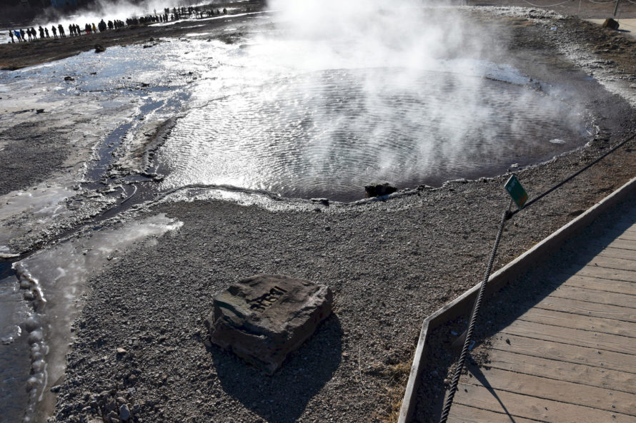 Кстати говоря, этот гейзер, что вы видите на фото выше, называется “Строккюр”. Извергается он достаточно часто, где-то раз в 5 минут или что-то около того. Потому и является самым привлекательным для жаждущих зрелищ посетителей. Но если пройти всего каких-то 40 метров выше, то мы наткнемся на гейзер под названием “Гейзер” или точнее “Geysir”. Именно он и дал название такому явлению природы, как “гейзер”.