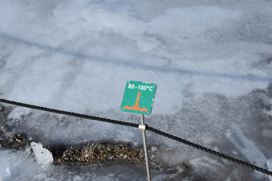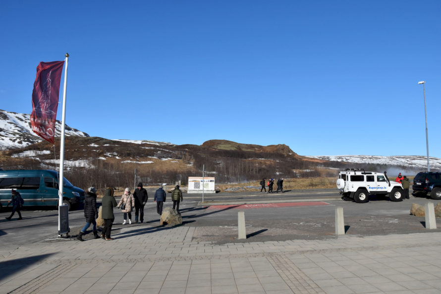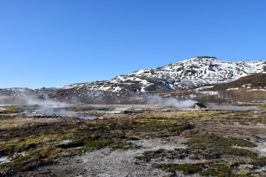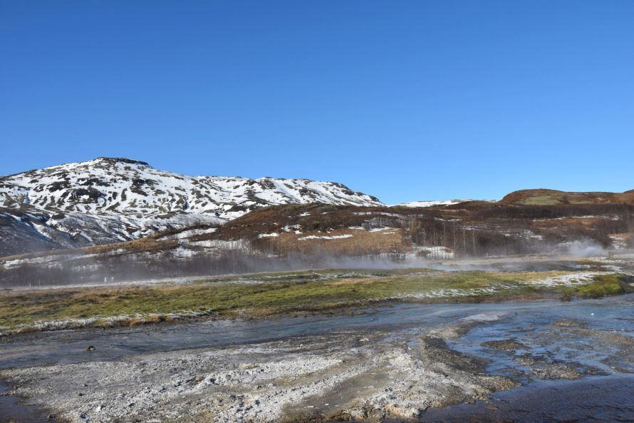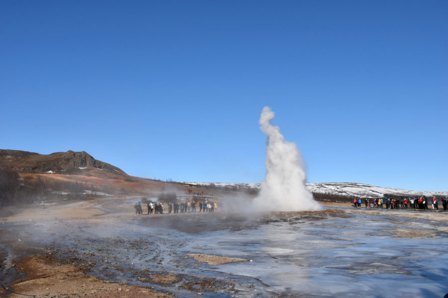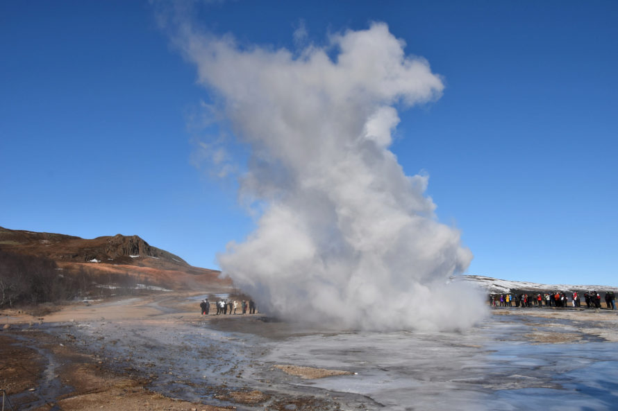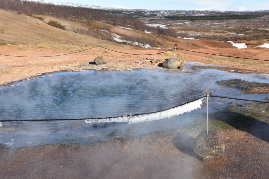 Кстати говоря, этот гейзер, что вы видите на фото выше, называется “Строккюр”. Извергается он достаточно часто, где-то раз в 5 минут или что-то около того. Потому и является самым привлекательным для жаждущих зрелищ посетителей. Но если пройти всего каких-то 40 метров выше, то мы наткнемся на гейзер под названием “Гейзер” или точнее “Geysir”. Именно он и дал название такому явлению природы, как “гейзер”.