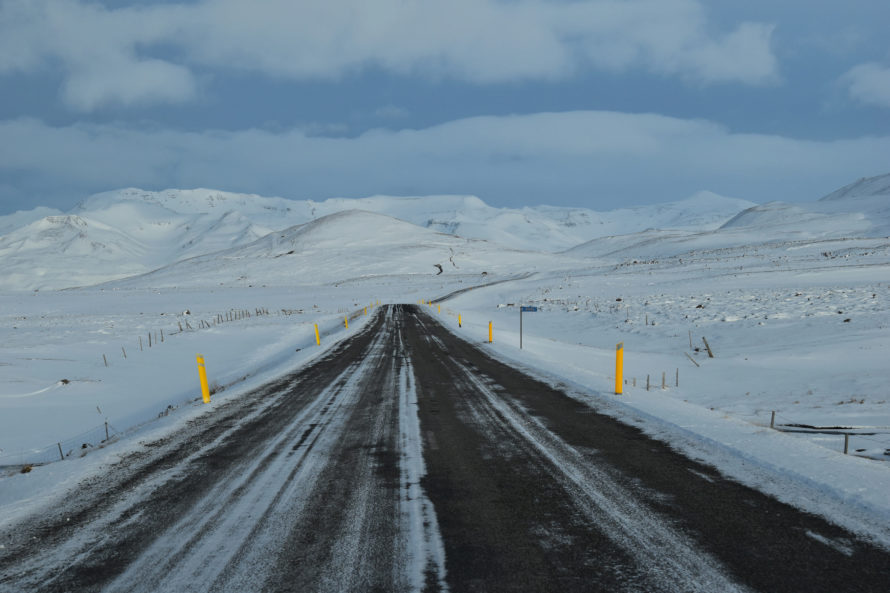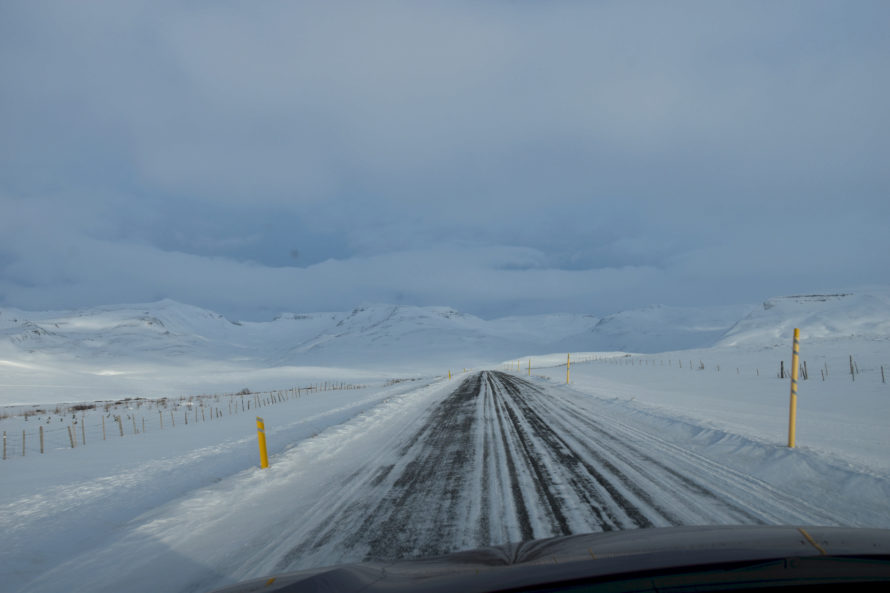 Дорогу я проложил к своему следующему пункту назначения, а именно знаменитому озеру Myvatn - самому знаменитому и красивому озеру Исландии. Когда я отъехал немножко от Akureyri начался снежный шторм, дорогу засыпало снегом на глазах, видимость резко упала, и я стал чувствовать, что машина ведет себя гораздо менее уверенно на дороге. Ехать со скоростью более 60 км/час было невозможно. Ну то есть мне невозможно, но не Исландским дальнобойщикам.