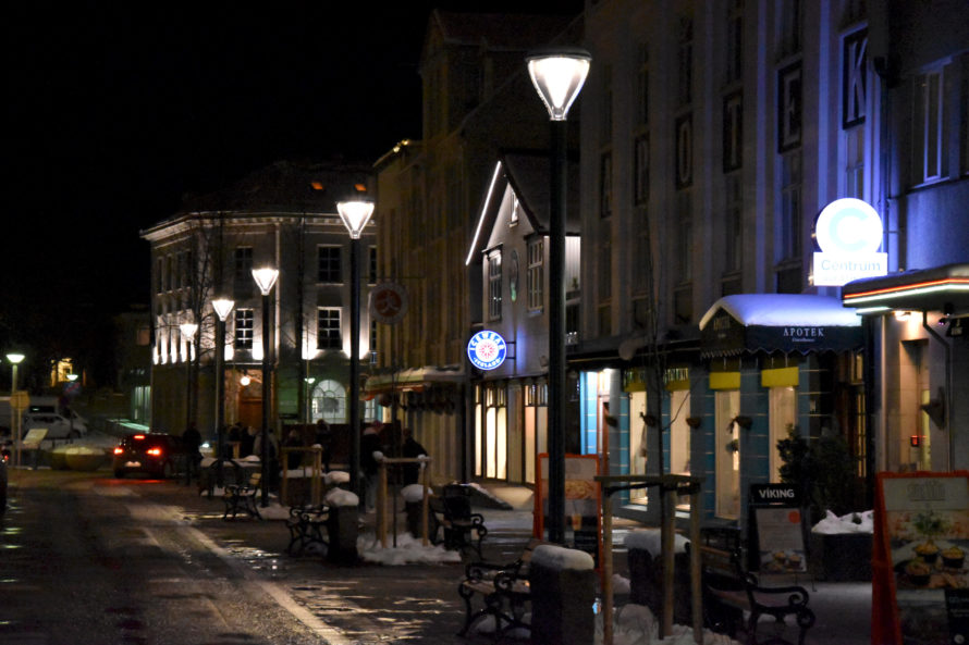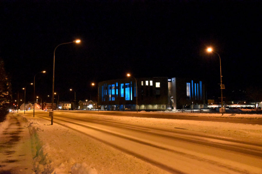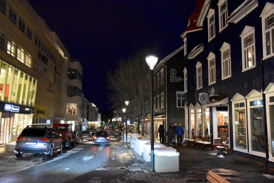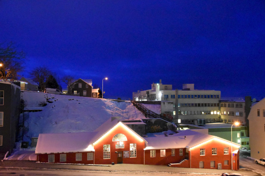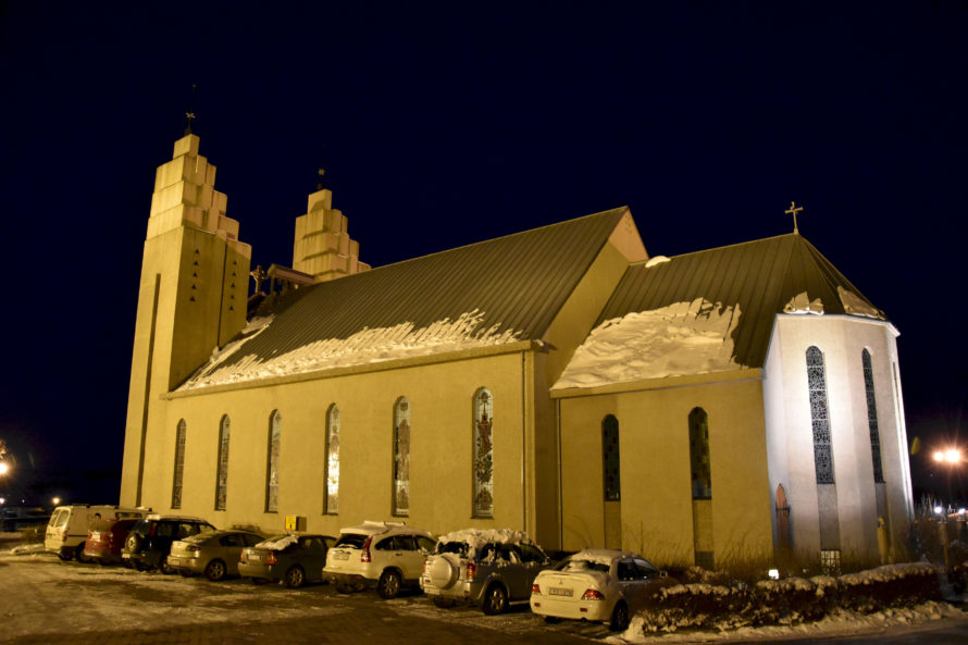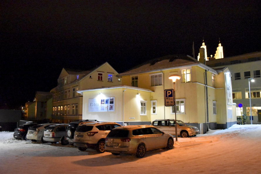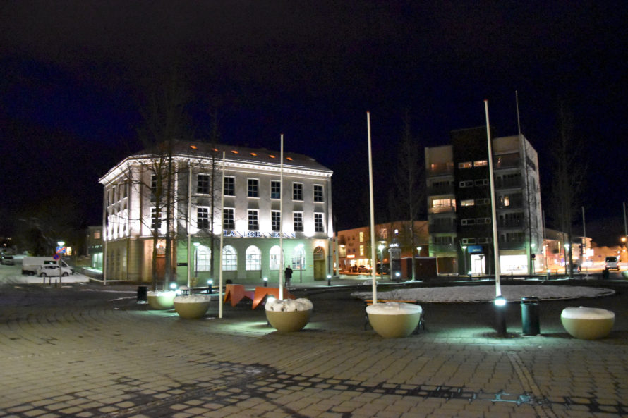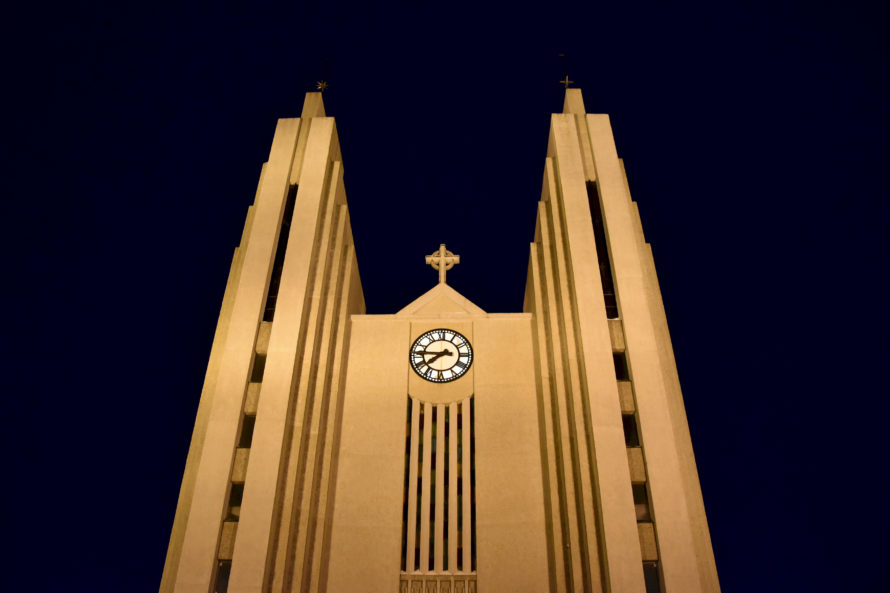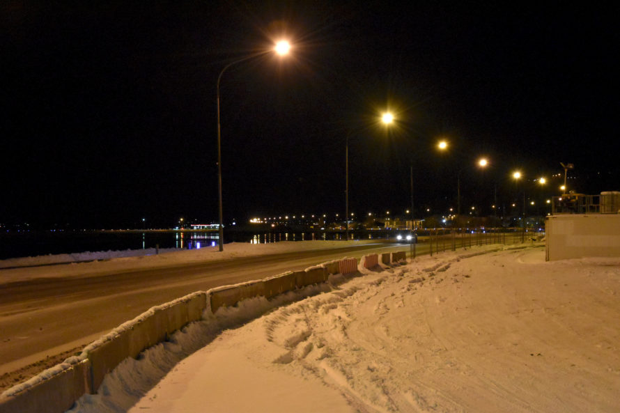 Проехав эту деревушку, я решил ускориться и постараться добраться до Akureyri засветло, потому как хотелось избежать поездки в темное время суток. Дороги не освещаются, узкие, порой над такими себе внушающими обрывами… Короче не самый приятный опыт для расслабленной ночной езды. Но, конечно, добрался я до Akureyri уже затемно, можно сказать поздним вечером. И поскольку у меня не было какого-то конкретного плана, где остановиться, я стал кружить по улочкам, чтобы найти какое-нибудь укромное местечко, где можно было бы переночевать. Но город оказался совсем уж мегаполисом и места такого у меня найти как-то не очень получалось. А просто где-то на дороге стоять что-то не хотелось. Когда я переезжал из одной части города в другую, то неожиданно оказался у самой главной достопримечательности города.