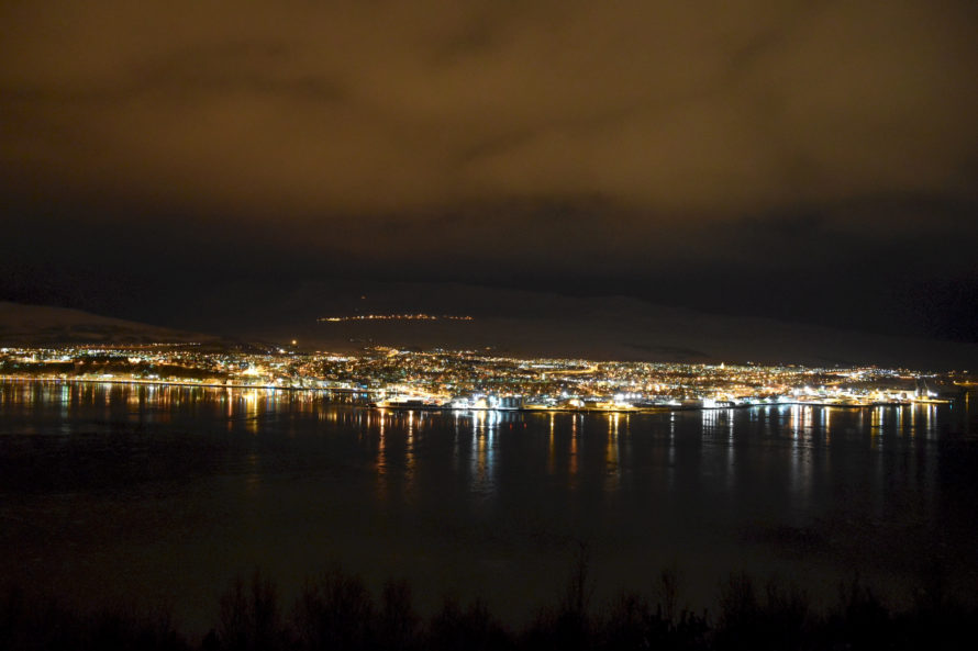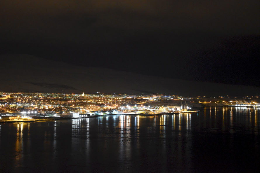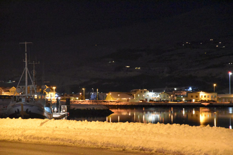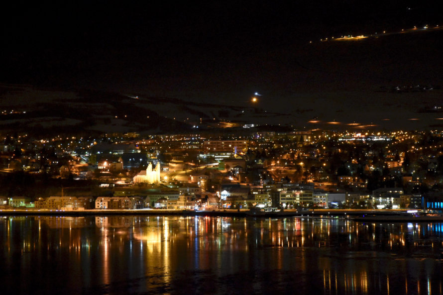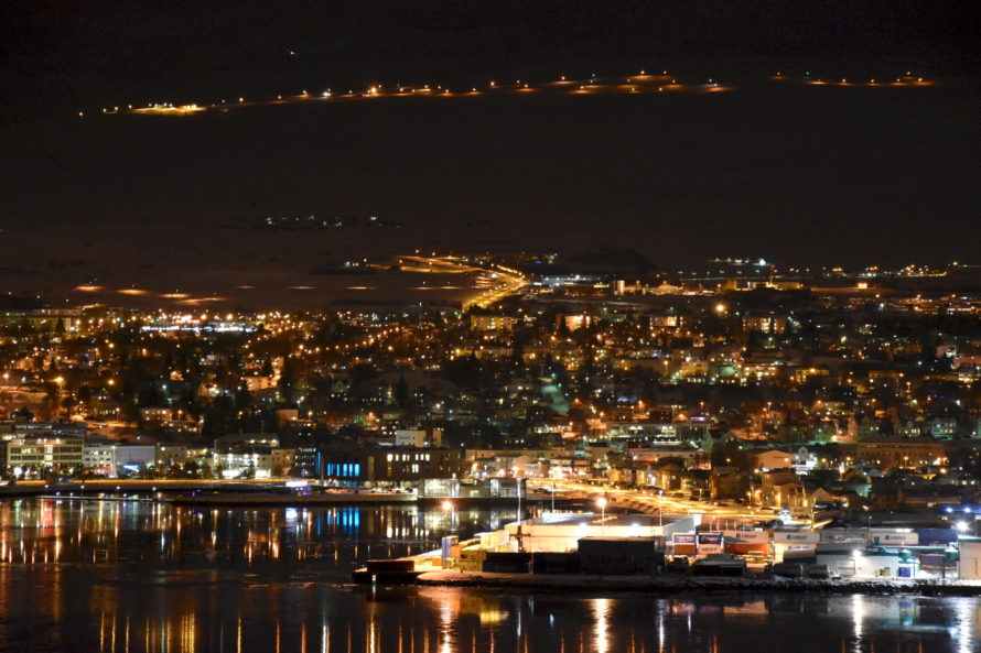 Отъехав какое-то расстояние от города, мне открылся замечательный вид ночного Akureyri светящегося в холодной бесконечности Исландии.