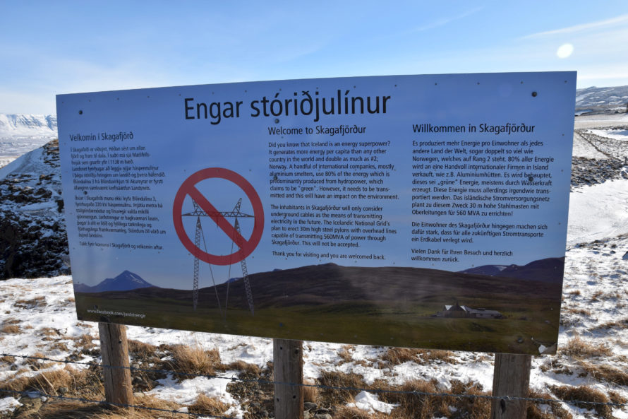 Информация для посетителей на трех языках: исландском, английском и немецком. Здесь говорится о том, что Исландия занимает место номер 1 в мире по выработке энергии по соотношению количество вырабатываемой энергии/жителей. Второе место занимает Норвегия, которая при этом вырабатывает в 2 раза меньше энергии, чем Исландия. Ну и написали еще, что если энергию транспортировать, то только подземными кабелями, а не на вышках. Мол, на вышках транспортировать энергию жители этого “Скагафьордура” никогда не разрешат.